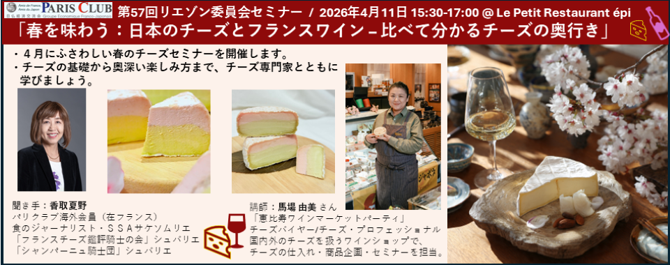 - 2026年4月11日第57回リエゾン委員会セミナー 「春を味わう:日本のチーズとフランスワイン – 比べて分かるチーズの奥行き」