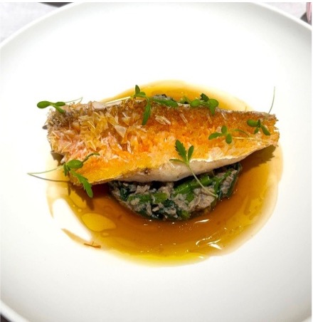 ・メイン: <福井からの白甘鯛 鱗をパリッと仕上げ 福井の舞茸・平茸 春菊のディクセル 茸とお野菜のソースで> 良質な甘鯛が手に入りメインはお魚料理に。 皮のパリパリ感に感嘆の声があがりました。