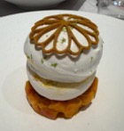 ・デザート <秋のヴァジュラン "カボチャ 林檎 バターナッツ ジャンドゥージャ ライム”> メレンゲの中にジャンドゥージャやアイスクリーム、フルーツなどがギュッとが詰まったデザート。 口のなかで、サクサク、ふんわり、ひんやりを一度に味わえました。