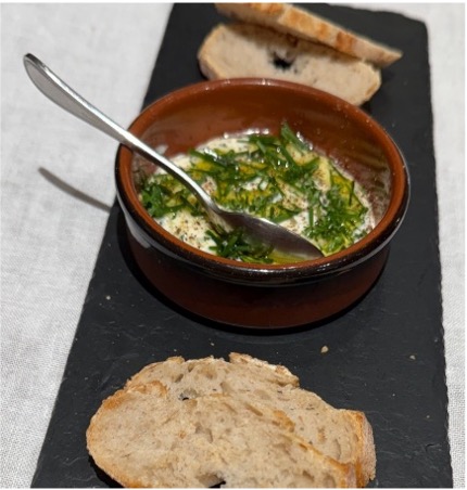 ・スープ: <人参のスープ 玉ねぎのクリスピー ミントのオイル> 甘くクリーミーな人参に香ばしい玉ねぎのハーモニーが悦妙。 自家製ミントオイルがアクセントを添えていました。